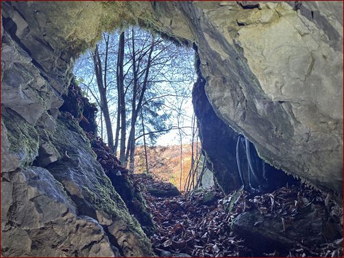 Blick aus dem Innern ... der kleinen Höhle, welche eine Länge von ca. 25 m aufweist und die sich im hinteren Bereich stark verengt. In den Tiefen des Gesteins hört man das Wasser strömen und glucksen. Das Wasser selbst kommt vom "Platoul Poieni", dessen steile felsige Abhänge sich hinter dem hiesigen Karstplateau erheben. |