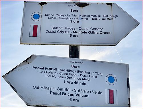 ... am Abzweig zur Cascada Pisoaia befindet sich ein geräumiger Autoparkplatz. Der weitere Weg führt über den Raul Ariesul Mic hinweg, bis man an eine quer verlaufende schmale Asphaltstraße gelangt. Hier befindet sich ein erster Wegweiser hinauf zum Plateau. Man kann die Wanderung nach links als auch nach rechts beginnen. Die entscheidende Wandermarkierung ist der "Blaue Punkt"! Hier am Wegweiser wird angezeigt: nach Links: ... Dosu Luncii - Calea Pietrii - Sat Harasti (Fantana lu' Ciun) - Platoul Poieni = 2,5 Stunden ... / ... nach Rechts: ... Lunca Nemesilor - Sat Incesti - La Codii - Hoanca Matului - La Tau - Lunca Trocului - Sat Harasti (Fantana lu' Ciun) - Platoul Poieni = 4 Stunden. Die Gesamtlaufzeit beträgt somit 6-7 Stunden. Ich entschied mich für die Variante nach links über Dosu Luncii ... |