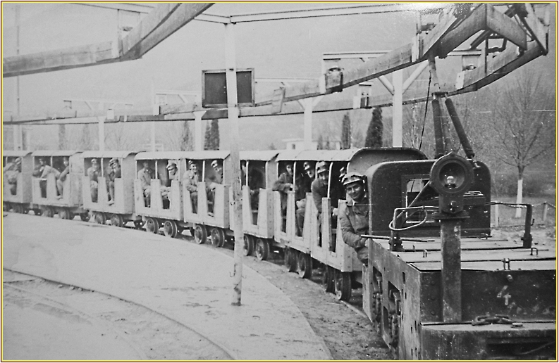 ... der in Baia de Aries gewonnenen Erze in der Zeit nach dem 2. WK erfahren wir unter [8]: "... Im Jahre 1957 wurde die mit rumänischen Aggregaten ausgerüstete Aufbereitungsanlage für Golderze mit einer Kapazität von 250 t/Tag dem Betrieb übergeben. 1959 begann man mit der Cyanid-Goldaufbereitung als zweite ihrer Art in ganz Rumänien, zu der im Jahre 1963 eine weitere, mit doppelter Kapazität (d.h. mit 500 t/Tag) hinzukam. Eine dritte mit gleicher Kapazität begann ihre Produktion´am Beginn des Jahres 1992. ..."Im Jahr 1957 betrug das abgebaute und aufbereitete Erz = 38116 t bei insgesamt 202,8 kg Gold. Im Jahr 1962 abgebautes und aufbereitetes Erz = 265000 t bei insgesamt 539 kg Gold. 1965 arbeiteten in Baia de Aries 3037 Angestellte, davon 2661 Grubenarbeiter. Die Entwicklung des Bergbaus und seiner Gruben verlief ohne Unterbrechung mit gar steigenden Fördermengen an Erzen bis zur Schliessung aller Anlagen im Jahr 2004. Abschliessend dazu ein paar letzte Anmerkungen aus [8]: "... Als diese Aufbereitungen (neue Aufbereitungsanlagen der Komplexerze) von der Filiale Societatea Miniera Baia de Aries der Bergbaugesellschaft "C.N.C.A.F. "Minevest", S.A. Deva im Sommer 2001 im Zuge des geltenden Fünfjahrplanes konzipiert worden sind, ging man von einer Lebensdauer der Bergwerke bis zum Jahre 2018 aus, doch fielen schon im gleichen Jahr auf Regierungsebene wichtige, anders lautende Entscheidungen. ... Durch Regierungsbeschluss 926/2003 wurde auch die Golderzaufbereitung eingestellt. Nachdem auch die Komplexerzaufbereitung schon seit gewisser Zeit außer Betrieb stand, wurde auch diese auf Grund des Regierungsbeschlusses Nr. 1846 vom 28. September 2004 für immer geschlossen." <- Historisches Foto aus der "Colectie Muzeala Miniera" |