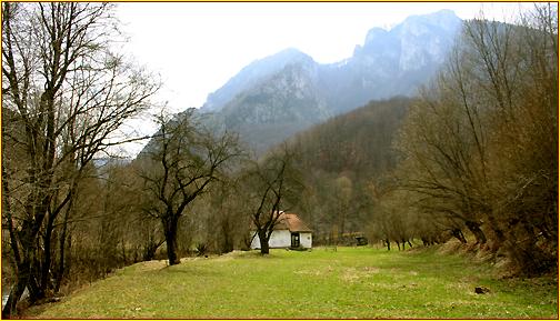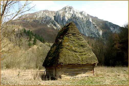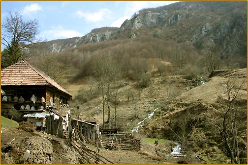 Isoliertes Bauernhaus ... im Valea Bradestilor. Geht man im Valea Cheii bachaufwärts, so gelangt man nach ca. 20-30 min. zum Abzweig in die Cheile Geogelului (linksseits). Hier vereinigen sich die Bäche des Valea Geogelului und des Valea Bradestilor zum Cheii. Folgt man dem Haupttal geradeaus, so erreicht man nach ca. 15 min. dieses alte Bauernhaus. Der aufmerksame Wanderer erblickt natürlich sofort die alten Bienenkörbe. Rechts im Bild ragt die Felswand des Urmazau empor. |