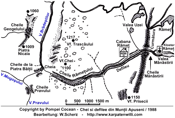 Über den Abschnitt Cheile Manastirii und Cheile Râmetului wurde bereits unter: http://www.karpatenwilli.com/images/dia26.htm berichtet. Die Anreise erfolgt über die -E 81- (1) mit Abzweig in Teius über Stremt - Geoagiu de Sus und weiter das Valea Manastirii hochwärts. Für normale Fahrzeuge der einzige sichere Anfahrtsweg. Achtung: Viele Touristen verwechseln eine Anfahrt zur Cheile Râmet mit dem Abzweig in Aiud (Aiudul de Sus), zur Gemeinde Râmet (siehe unten) hinauf. Rucksacktouristen können sich dem Gebiet aus allen Richtungen nähern. Die Wanderwege dieser Region sind gut markiert -> siehe "Kartenübersicht"! |