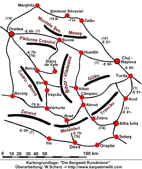 Die Lage ... ... des Muntii Apuseni wird im Süden durch den Verlauf des Mures-Flusses abgegrenzt, der entlang der -E 68- (7) Orastie - Deva - Arad verläuft. Im Westen enden die Gebirgszüge in einem Flach- und Hügelland, etwa entlang der Landstrasse Paulis - Pâncota - Bocsig - Tinca - Oradea. Im Norden etwa entlang der Ortschaften Oradea - Marghita - Zalau - Jibou - Cluj-Napoca. Die östlichen Ausläufer des Muntii Apuseni enden etwa entlang der -E 81- (1) Cluj - Turda - Aiud - Teius - Alba Iulia - Orastie. In jedem Falle zu erwähnen: Die ethnografischen Besonderheiten dieser Region, die weniger in den Städten, aber desto intensiver noch in den Gemeinden und Bergdörfern vorzufinden sind. Die hier lebenden Bergbauern (Motzen) sind für jeden Besucher ohnehin etwas ganz besonderes. Allerdings, niemand weiss es, verlässt man sich auf die einschlägigen Rumänienführer des deutschen Buchmarktes. Allein dies ist ein Grund, die Apuseni-Region auf dieser Webseite gesondert aufzuführen. Der Besucher habe Geduld und Nachsicht, wenn erst nach und nach die Informationen über die Apuseni verfollständigt und ergänzt werden. Weitere Infos: |