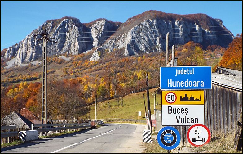 Im Jahr 1869 finden wir in einer österreichischen Literaturquelle vermerkt [1]: "... Im Westen von Abrudbánya (Abrud) steigt eine imposante Kalkmasse auf, welche die ganze Gegend beherrscht und bei jeder Fernsicht von den Gipfeln des Erzgebirges von allen Bergen durch seine senkrechten Abstürze auffällt. Es ist der "Vulcan". Diese Klippe ist aus einem Kalkstein aufgebaut, der sich im Aussehen von dem dichten Kalkstein von Torockó (Rimetea) nicht unterscheidet. Wenngleich am Vulcan Neocomversteinerungen (Neokom ... veralteter Begriff für untere Unterkreide) gefunden wurden, so dürften doch die unteren Schichten dasselbe sein, wie jene Kalkbildung. ..." In der Tat wurde es schon treffend beschrieben, dass die Muntele Vulcan mit ihrer höchsten Erhebung des Vf. Vulcan (1263 m) das Landschaftsbild aus beinahe allen Richtungen weithin überragen, was ich auf dieser Seite auch gerne veranschaulichen möchte. In Wikipedia erfahren wir über Muntele Vulcan, dass es aus jurassischem Kalkstein besteht, in dessen steil abfallenden Riffhängen sich zahlreiche fossile Überreste finden, welche von versteinerten Korallen herstammen. Ähnliche fossile Fragmente finden sich auch im Kalkstein der 24 km (Luftlinie) entfernten Cheile Craciunesti bei Baita. |