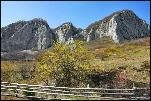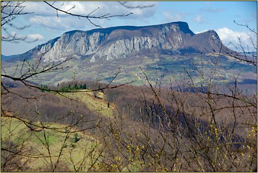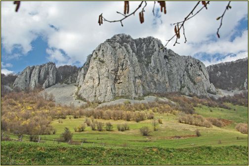 Blick durch das Teleobjektiv ... von den sanfteren nordwestlichen Abhängen der Muntele Vulcan, auf den Vf. Strambul (1154 m) mit seinen südlichen Felsflanken. Unten im Tal verläuft der Rau Crisul Alb. Unterhalb des Strambul-Massivs befindet sich das Streudorf Ret. Ganz rechts oben im Bild erkennt man den Vf. Plutonu, der aber mit seinen 1183 m nur eine bewaldete Kuppe bildet. |