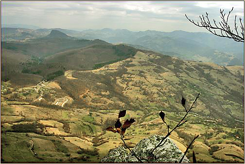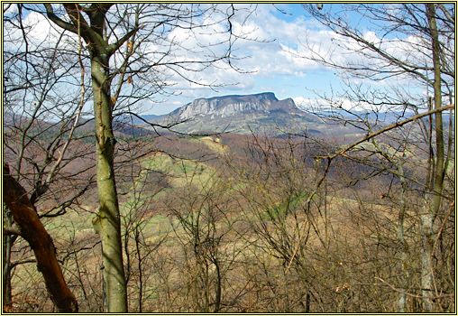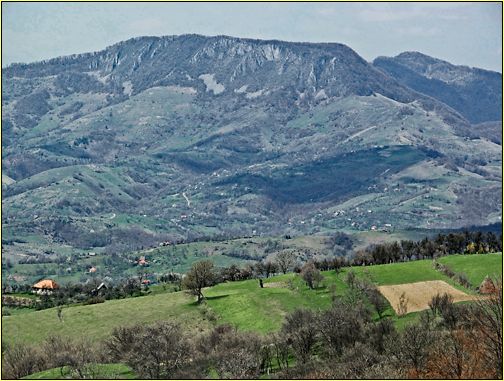 Blick vom Plateau ... der Muntele Vulcan über die südlichen Steilflanken hinweg. Tief im Tal befindet sich der Ort Buces, in dem auch eine kleine Straße nach Stanija abzweigt. |