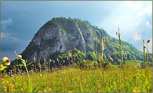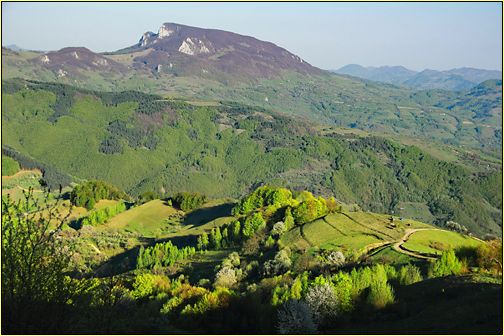 Vf. Bradisorului (1034 m) Die östlichen Steilflanken des Vf. Bradisorul, von den umliegenden Hochweideflächen betrachtet. An den südlichen Abhängen unterhalb des felsigen Gipfels verteilen sich viele kleine Höfe des Streudorfes Dupa Piatra. |
