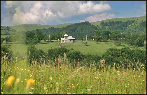 Die kleine Dorfkirche ... des kleinen Streudorfes Vulcan befindet sich unterhalb der östlichen Steilflanken der Muntele Vulcan. Und hat man dem Vulcan-Massiv den Rücken zugeneigt, dann blickt man auf das eher hügelige Bergland, dessen Höhen häufig die 1000-Meter-Marke überschreitet. |