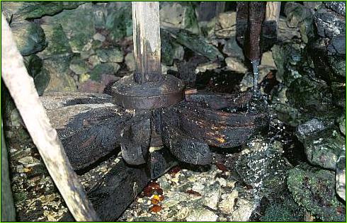 "Moara Dracilor" Übrigens hat sich das Teufelchen ganz typisch regionaler Techniken bedient, was man auch an dem wassergetriebenen Schraubenrad sehen kann. Beinahe alle Wassermühlen in der Region der Mehedinti werden mit solchen Antrieben versehen. Wasserräder findet man hier kaum. |