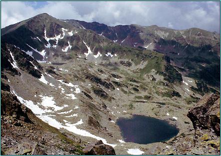 Oberhalb der Bergseen L. Vidal und L. Câlcescu Innerhalb dieses Beckens findet man 10 weitere kleine Bergseen vor. Man verlässt an dieser Stelle die Kammmarkierung -Rotes Band- und steigt über die Markierung -Rotes Dreieck- zunächst zum Lacul Vidal ab. Bis in den Juni hinein erfolgt der Abstieg über eine steile Schneerinne rechtsseits (siehe rechts im Bild). Vorsicht, grosse Rutschgefahr!) Am unteren Seeufer des Lacul Câlcescu findet man eine alte Wegmarkierung -Rotes Band-, welche nach links über den Lacul Zánoaga wieder zum Kammwanderweg emporführt. Vorsicht: Markierung sehr verblasst! |