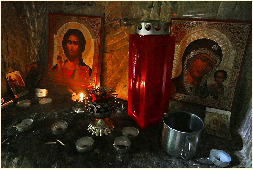 LIm Innern ... der kleinen Zelle. Der kleine Höhlenraum von ca. 2 x 3 m diente als schlichtes Quartier. Zu den Mahlzeiten kamen die Mönche sicherlich in der großen, tiefer gelegenen Zelle zusammen. Linksseits der Kirche befindet sich eine weitere kleine Zelle im Fels. |