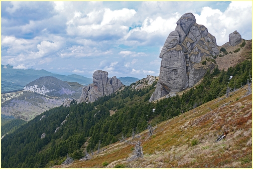 Die ersten malerischen Felsen ... erheben sich gleich hinter Cabana Varful Ciucas. Nach einem guten Essen und rumänischen Bier wanderten wir weiter hinauf Richtung Vf. Ciucas. ... |