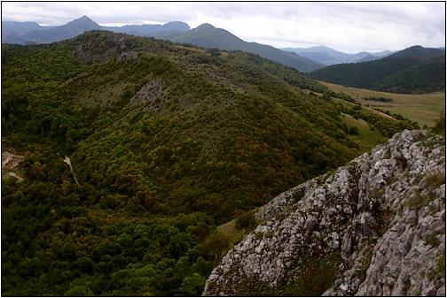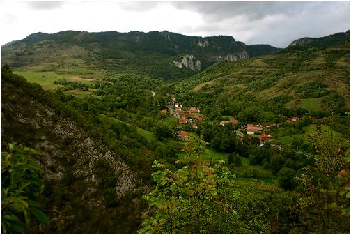 Blick auf Remeti Der Ort liegt inmitten eines wunderschönen Karstgebietes. Das hier verlaufende Tal ist zugleich die Wasserscheide zwischen den Muntii Vladeasa und den Muntii Padurea Craiului. Das Foto, geschossen von den westlichen Abhängen der Muntii Vladeasa, zeigt im Tal die Ortschaft Remeti. Auch hier oben gibt es mehrere kleine, aber nicht weiter spektakuläre Höhlen. |