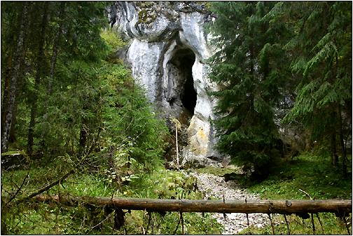 Höhle 3416/4 Der Weg von Doda Pilii bis zur ersten ansteigenden Serpentine, hinauf zum Pasul Prislop, führt durch ein schönes Karstgebiet. Wer dafür ein Auge hat, entdeckt die nahe der Strasse gelegenen drei Karstquellen relativ leicht. Einige kleine Höhlenzugänge machten mich dann doch neugierig und ich recherchierte spontan etwas genauer ... Das Portal der Höhle 3416/4 ist trotz Nähe zur Strasse nicht von der Strasse her einsehbar. Es wird durch die dortigen Fichtenbestände verdeckt. Erst wenn man zum Pass hinauffährt, erblickt man aus der Höhe dieses Portal! |
