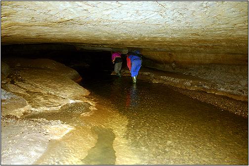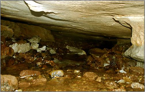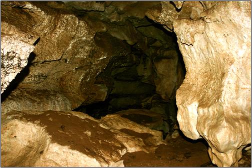 Innerhalb des begehbaren ... ... Höhlengangs findet man schöne Wandablagerungen und auch einige schöne Formationen vor. Nach ca. 30 Meter endet dann aber die Passage an einer senkrechten Fallstufe von ca. 10 Meter. Hier ist ohne Ausrüstung nichts mehr zu machen. Unten setzt sich der aktive Abschnitt der Höhle, in der ein Höhlenbach fliesst, fort. |