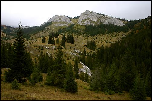 Pietrele Albe Blick vom Wanderweg (Markierung -blauer Punkt-) auf die Pietrele Albe. Von hier aus gelangt man auch über die weiter oben befindliche Markierung "roter Punkt" zur höchsten Erhebung der Muntii Vladeasa, dem Vf. Ladeasa (1836 m). Laufzeit ca. 3-4 Stunden. Man kreuzt dabei einen nach rechts führenden Forstweg (mit den Markierungen "roter und blauer Punkt" + "blaues Band"), der direkt hinüber zur Cabana Vladeasa führt (ab Weg ca. 2 Studen). |