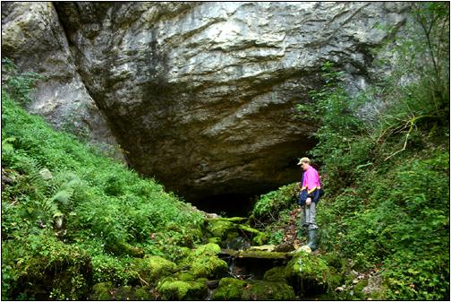 Pestera cu Apa de la Lesu Alex Györfi vor dem ca. 15 m breiten Portal der Höhle. Die Höhle befindet sich in der Valea Lesului. Amateurforscher aus Cluj haben die Höhle in Jahr 1953 erstmals begangen, später folgten umfassende Forschungen, ausgehend vom Institut "Emil Racovita". Die Gesamtlänge der Höhle beläuft sich auf ca. 800 m. |