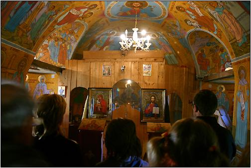 Im Innern ... ... der kleinen, provisorischen Kirche bei Stana de Vale. Jeden Sonntag wird hier natürlich ein Gottesdienst abgehalten. |