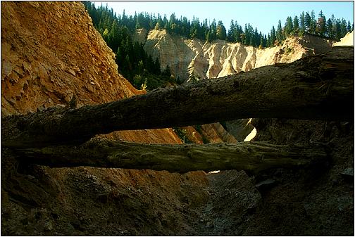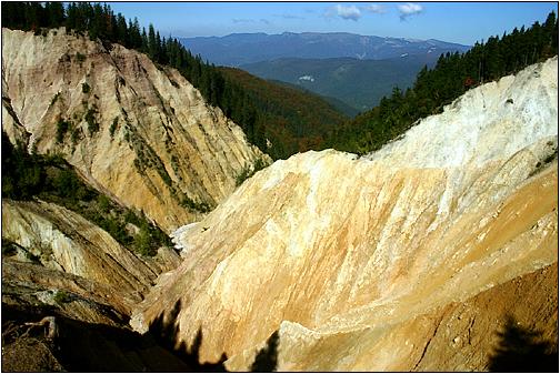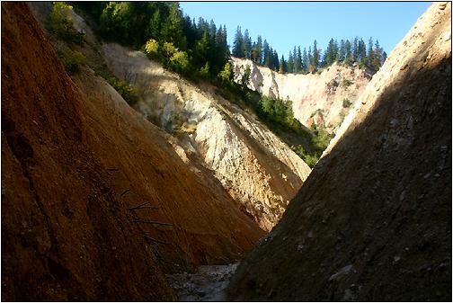 Das Gestein ... der Groapa Ruginoasa ist sehr instabil und erodiert unglaublich schnell. Wasser, Wind, Frost und Eis verändern das Areal ständig. Jeden Moment kann irgendwo ein ganzes Areal von den oberen Rändern wegbrechen, oder eine verbliebene Zinne inmitten der Schlucht einstürzen. |