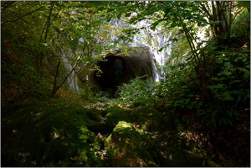 Das riesige Portal ... ... ist dennoch nicht ganz einfach auffindbar. Ich fuhr zunächst von Baita Richtung Baita Plai. Nach ca. 2 km zweigt nach links ein Tal ab, in dem sich ein grosser Betriebskomplex befindet. Hier wird Kalkstein gebrochen und weiter verarbeitet. Laut Karte führt aber hier eine Strasse im Tal des Crisul Baita hinauf (Wandermarkierung "rotes Dreieck"). Durch das Betriebsgelände kommt man nicht durch, kann dies aber linksseits umgehen. Dann gehts weiter auf einer Forststrasse und man kommt wenig später an einen weiteren Bergbaukomplex. Von da aus sind es dann noch ca. 2 km bis zu einem weiteren nach links abzweigenden Tal. Dort befindet sich das Portal der Pestera Poarta Bihorului! |