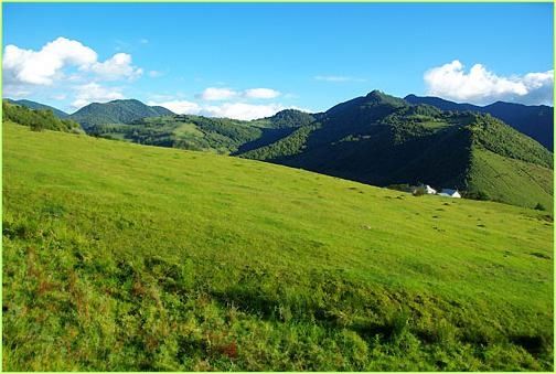Überall auf dem Kamm ... findet man kleine Berghütten (Sommerwirtschaftshäuser, Sennhütten, Viehställe). In der Ferne erheben sich die höheren bewaldeten Südausläufer der Muntii Bargau.