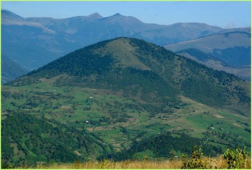 Blick kurz unterhalb Vf. Magura Neagra (1321 m) ... gen West auf das Lesu-Tal. Ganz in der Ferne sieht man die ineinander übergehenden Orte Lesu und Lunca Lesului. Der Blick langt auch hinüber auf den südlichen Abschnitt des Bargau-Gebirges, der sich bis auf 1611 m erhebt und durchweg bewaldet ist. Vom höchsten Gipfel des Gebirges, dem Heniul Mare, auf dem es auch eine grosse Wetter.- und Sendestation gibt, hat man Ausblicke auf alle umlaufenden Gebirgsabschnitte: Rodna, Suhard, Calimani ...