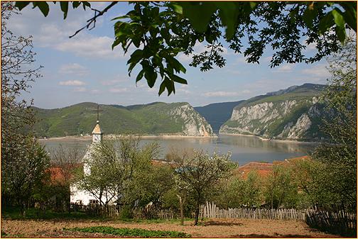 Cazanele Mici Die kleine Donauenge. Dahinter weitet sich das rechte Ufer zu einem grossen See, wo sich auch der kleine Ort Dubova befindet. |