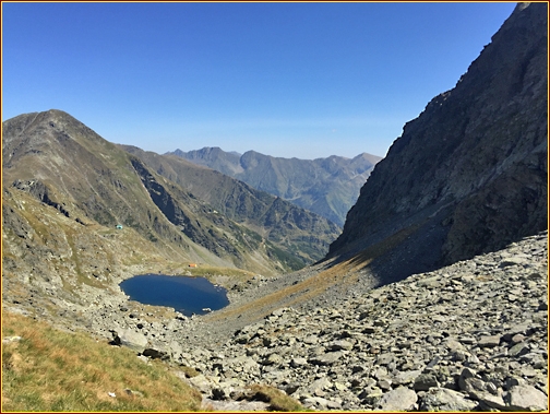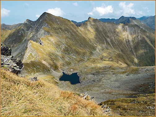 später ... blicken wir vom Kamm auf den Lacu Podragu. Dahinter (Bildmitte) erkennen wir die Cabana Podragu. Aber unser Weg führte uns noch ein Stück weiter, näher an den Vf. Vistea Mare heran ... |