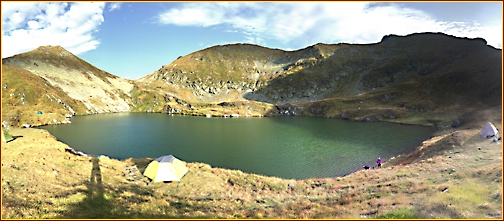 Zeltlager ... in der Caldera Pietroasa. Wir geniessen in der Abendsonne den Blick auf die südlichen Ausläufer des Fagaras-Gebirges. Die Ausdehnung des Gebirges beträgt etwas über 2000 km². In dieser Fläche gibt es so gut wie keine einzige Ortschaft. Die Gesamtfläche der Fagaras-Gruppe (Fagaras - Cozia - Iezer-Papusa) beläuft sich sogar auf eine Gesamtausdehnung von ca. 3000 km². |
