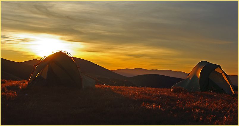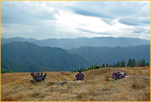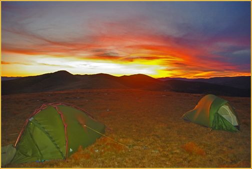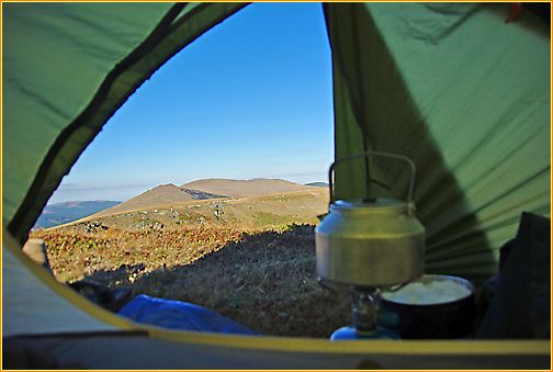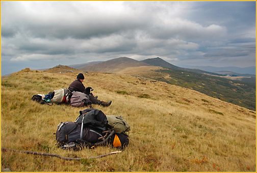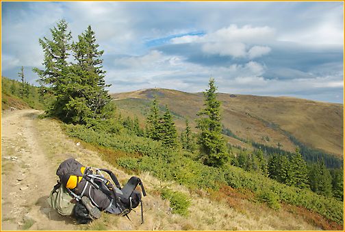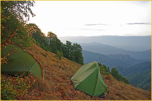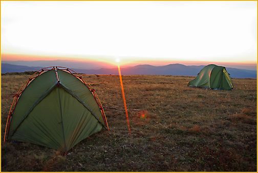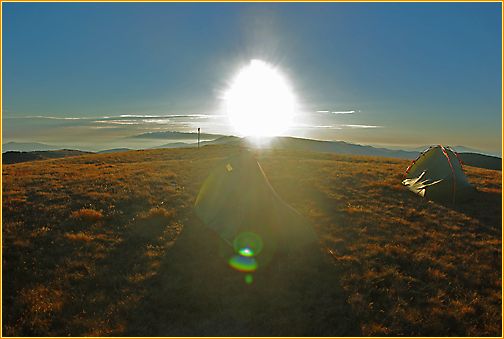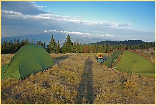 ... haben wir verpasst und gelangen zunächst ein Stück bergab in ein beginnendes Waldtal. Von einigen Waldarbeitern erfahren wir, dass wir hier falsch sind. Es ist schon spät und ich "verliere" mein letztes Bier in mir! Also wieder ein Stück bergauf und einen weit am Berghang geschwungenen Waldweg gefolgt. Die Dämmerung bricht herein und an einer Wasserstelle frischen wir noch unsere Vorräte auf. Wenig später kommen wir aus den Wald heraus und erklimmen im wirklich letzten Tageslicht noch eine steile Bergwiese bis die Dunkelheit hereinbricht. Wie steil wir hier bei Plesa Oii (1188 m) zelten, sahen wir erst am nächsten Morgen! |