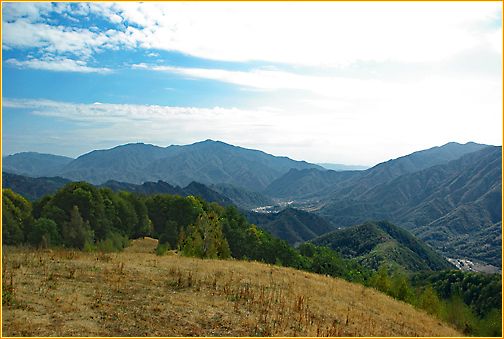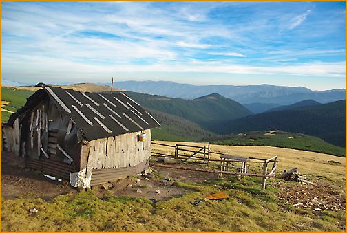 ... bei Valea lui Stan. Nur wenige Meter das Tal hinein, zweigt links eine alte Markierung -blaues Band- ab und steigt stetig bergan. Da wir für die komplette Tour über Lotru und Cindrel Lebensmittel mitführen, ist das Gewicht unserer Rucksäcke entsprechend. Wir kommen nur langsam voran - zumal ein sonnig-warmes Klima herrscht. Der Aufstieg führt vorbei an wunderschönen kleinen Sennhütten und auf einer ersten Hochweidefläche bieten sich Weitblicke auf Brezoi und das sich in der Ferne erhebende Cozia-Massiv. |