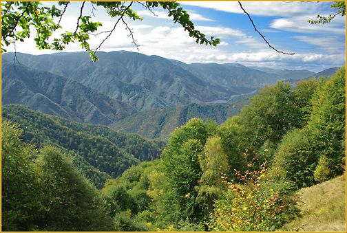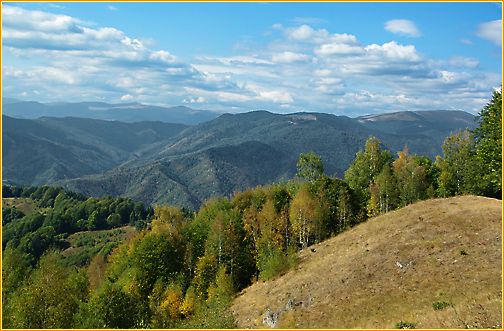 ... über den Balindru-Bergrücken ... In der Ferne sieht man bereits den höchsten Gipfel der Muntii Lotrului, den Vf. Steflesti (Bildmitte rechts). |