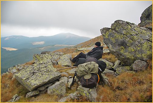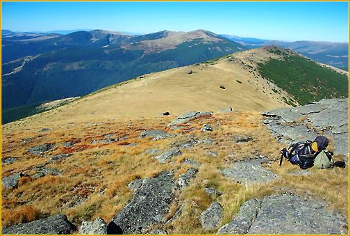 ... erreichen wir nahe Vf. Robu (1899 m) den Bergrücken Murgas und stossen hier auf eine Markierung -rotes Band-. Diese Strecke beginnt direkt am Olt zwischen den Dörfern Robesti und Balota. Bei Robesti gibt es eine Haltestelle der Bahnstrecke durch das Olttal. ... Wir errichten hier unsere Zelte unter der bereits tief stehenden Sonne. In der Ferne sieht man den Lotru-Hauptkamm. |