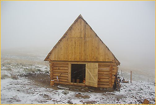... vom Vf. Sterpului über Cocacii (2008 m) und Voineagul Catanesei (1960 m) nahm der Regen zu und Nebel kam auf. Da sich das Wetter zusehends verschlechterte, fiel unsere Wahl auf die neue Hirtenhütte. Kurz vor Voinesita mussten wir nach rechts schwenken, aber wohin genau in dem dichten Nebel? Wir hatten Glück und stiessen auf eine Schafherde. Die Hirten begleiteten uns ein Stück des Wegs und gingen dann weiter zu ihrer tiefer gelegenen Hütte. Wir indes hatten unser neues Domizil erreicht und richteten uns häuslich ein. Entsprechend unseres Arbeitsteilungsprinzips machte Hans Feuer und ich holte Wasser von einer nicht weit entfernten Quelle, was im Nebel nicht so ganz einfach war. Hans hingegen hatte direkt vor der neu erbauten Hütte noch reichlich Schnittholzreste. In der Nacht wurde ich wach. Draussen ging ein Schneesturm ab und Hans war damit beschäftigt, in der nicht ganz dichten Hütte seine Zelthülle als Überdach einzurichten. Am nächsten Morgen blickten wir nach draussen und staunten nicht schlecht: Schnee und dicke Nebelsuppe! Es bedurfte keiner Diskussion zwischen uns: Wir blieben hier - hatten wir doch alles um es uns gut gehen zu lassen :-) ... |