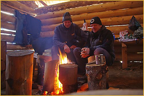 ... entwickelte eine neue Form des Schwedenfeuer-Prinzips. In die vorhandene Glut stellte er drei Rundhölzer hochkant zusammen und dann war unser kleiner und effizienter Brennofen fertig! Mein kleiner Weltempfänger diente der musikalischen Umrahmung, während Hans als Agitprop-Funktionär aus der Hermannstädter Zeitung vorlas ... und das alles garniert mit unserer mitgeführten Tuica! Ein ganz normaler Tag in den Muntii Lotrului! :-) |