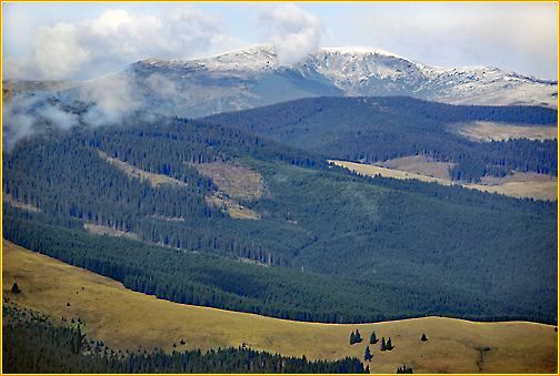 ... ist der ferne Kamm des Negovanul Mare (2135 m) noch vollständig mit Schnee bedeckt. Auf den Weg dorthin müssen wir zunächst über weite bewaldete Bergsättel auf ein tieferes Niveau absteigen. ... |