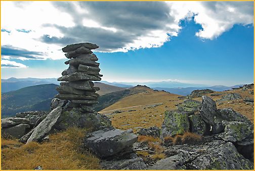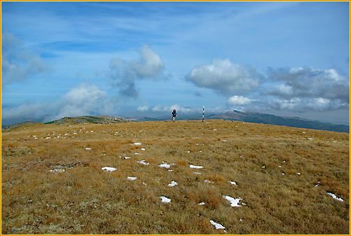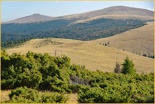 ... folgt die letzte Etappe über die Muntii Lotrului. Wir blicken noch einmal zurück auf den Vf. Cristesti (li. i. Bild) und der Piatra Alba (re. i. Bild). Wir folgenden der hier allmählich absteigenden Hochweide Richtung West/Südwest. |