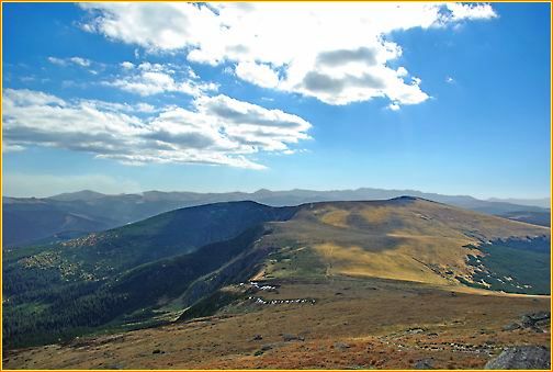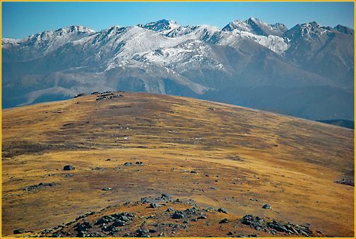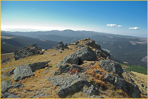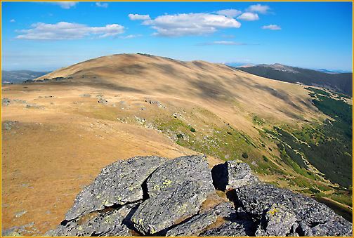 ... gen Südwest auf den langen Bergrücken der Piatra Alba. Charakteristisch sind die nach Nordwest sanft abfallenden Berghänge, während die südöstlichen Flanken durch steile Kare geprägt sind. ... In der Ferne verlaufen die hohen Bergkämme des Parang-Gebirges. |