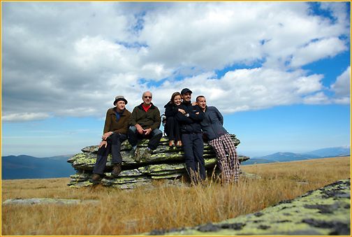 ... geht es wieder bergauf über weite Hochweideflächen zum Vf. Steflesti (2242 m / höchster Gipfel der Muntii Lotrului), wo wir auf eine Gruppe von Tagesausflüglern stossen. Sie sind über die Valea Balindru ein weites Stück die Forststrasse hinaufgekommen. Nach einem Gruppenfoto trennen sich unsere Wege wieder. Das waren übrigens die einzigen Bergwanderer auf der gesamten Strecke durch die Muntii Lotrului! Die Markierung -rotes Band- umgeht den Vf. Steflesti auf kürzesten Weg in Richtung Vf. Cristesti, so dass die meisten Bergwanderer - ohne es zu wissen - den höchsten Gipfel der Muntii Lotrului "verfehlen"!!! :-) |