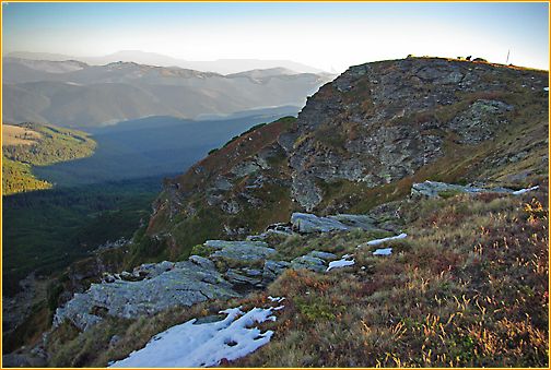 ... schauten wir erneut nach draussen: Sonnenschein pur und der gefallene Schnee war - bis auf die Bergkämme - bereits wieder geschmolzen. Eiligst wurde gepackt und wenig später pausierten wir schon auf dem Vf. Voinesita (1848 m) für einen letzten Rückblick auf unseren "Schicksalsberg", den Vf. Sterpului. |