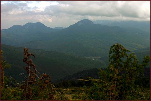 Blick unterhalb Vf. Turcu (1833 m) ... auf den 1706 m hohen Vf. Totpal-havas (höchster unbewaldeter Gipfel rechts im Bild). Um direkt zum Masivul Piatra Mare hinüberzuwandern, kann man diesen Gipfel übergehen. Dahinter folgt der Vf. Tigailor (ebenfalls von einer Hochweidefläche geprägt). Von dort folgt man einem bewaldeten Kamm Richtung Nordwest mit der ehemaligen Markierung -blaues Dreieck- über den 1447 m hohen Vf. lui Andir bis hinüber nach Poiana stanei din Pietricica. ... Ich schlug aber einen anderen Weg zum nahen Lacul Gavan ein. Man folgt dabei dem in der Bildmitte nach links auslaufenden unbewaldeten Bergrücken. Im Bildhintergrund erhebt sich das Masivul Piatra Mare und links davon das Masivul Postavaru. |