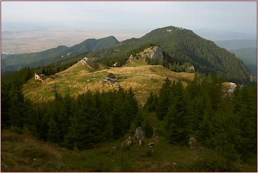 Abschied von Babarunca Blick unterhalb des Vf. Vaida (1528 m), dem nördlichsten Ausläufer des Grohotis-Gebirges in Richtung Nordost, auf Vf. Tesla (Bildmitte) und Muntele Dungu (links). Rechts der Bildmitte, im Tal gelegen, befindet sich Babarunca. Neben den Einstieg ins Grohotis-Gebirge ohne vorhandene Markierungen von Babarunca aus, gibt es einen direkten Übergang am Pasul Bratocea, welcher einst mit der Markierung -rotes Band- gekennzeichnet war. Auf Seiten des Ciucas ist diese Markierung durchgehend vorhanden. |
