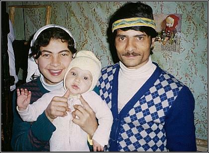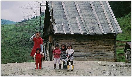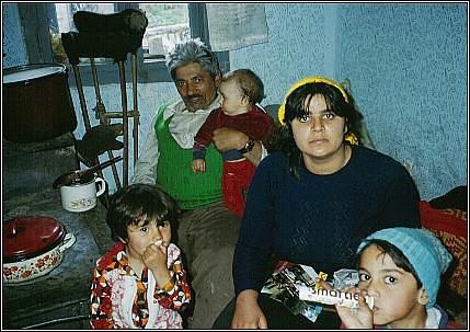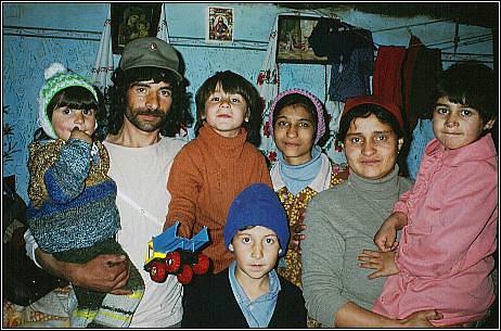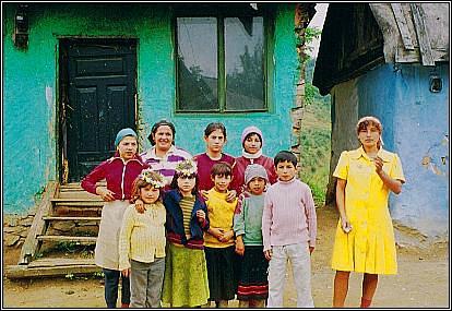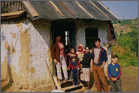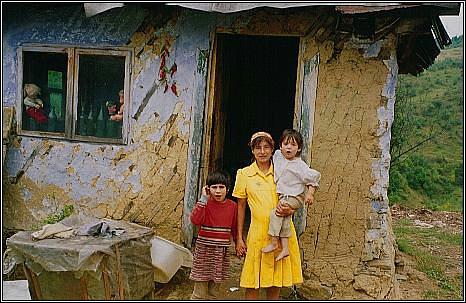 Dieses Foto (aus dem Jahre 1990) zeigt Ana ... ... mit zwei ihrer Kinder (derzeit war sie in Erwartung des 7. Kindes) vor dem eigenen Haus. Das Quartier besteht aus nur einem Raum. In ihm befinden sich links zwei Metallbetten nebeneinander und zur rechten Seite des Zimmers steht ein einfacher Blechofen, der gleichzeitig als Kochherd genutzt wird. Mehr findet in dem Haus keinen Platz und wird darum draussen unter Plastikplanen aufbewahrt. Mittlerweile wohnt Ana aber im 1 km entfernten rumänischen Bergdorf Rásinari. |
