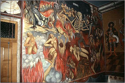 Die Malerei im Pronaos (Kirchenvorraum) mutet beinahe naiv an und behandelt links der Tür das Paradies und rechts die Hölle. |