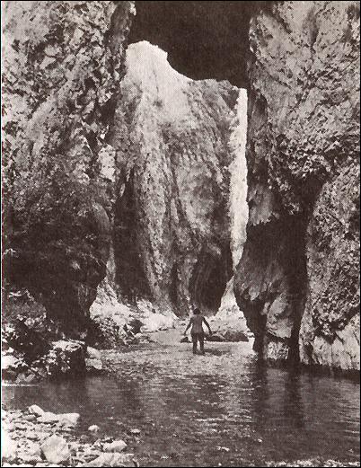 Wir jedenfalls gehen weiter. Erst meint man, es trockenen Fusses zu schaffen. Man schreitet auf Steinen, die aus dem Wasser herausragen , hangelt sich hie und da an einem willkommenen Kabel weiter ... aber alles bleibt Illusion. Das Wasser brodelt und schäumt immer mehr. Ein riesiger Felsbrocken scheint den Eingang in die Klamm zu bewachen. Die senkrechten Felswände nähern sich einander so sehr, dass man den Eindruck hat, durch einen engen Gang hindurch zu müssen. Kein trockenes Fleckchen mehr, kein Ufer, keine Steine, die einem weiterhelfen könnten. Wer die Râmeti-Klamm so erleben will, wie sie wirklich ist, wild, rauh, phantastisch, muss isch überwinden und durchs kristallklare, aber eisklate Wasser waten, auf rutschigen, wackligen, spitzen Steinen, barfuss, die Hosen hochgekrrempelt. Aber es zahlt sich aus! Wir gehen gegen den Strom und haben Bilder von wilder Schönheit vor Augen, eines interessanter und verlockender als das andere. Immer weiter dringen wir in diese Welt des dramatischen Ringen des Wassers mit dem Fels. Da - ein reisiges Portal, wie von Meisterhand geformt. Wir gehen unter diesem Portal durch wie Helden unter einem Triumphbogen ...