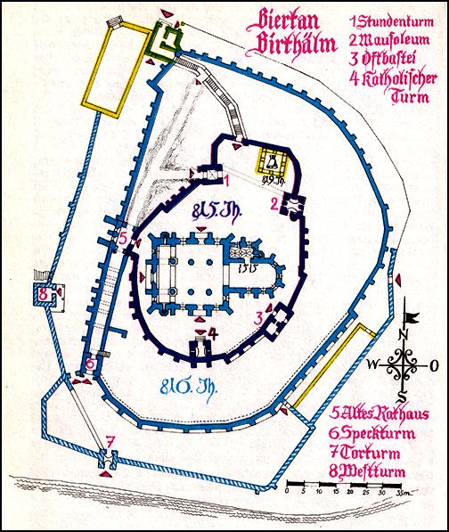 Anfang des 16. Jh. legte man auch den nahezu rechteckigen, hohen Mauergürtel aus Bruchstein um die Kirche. Im NO springt noch ein zweigeschossiger Wehrturm mit Pultdach und Pechnasen vor die Mauer vor, im SW stand ein gleicher. Die Einfahrt lag in der Westfront, was die noch vorhandenen Gleitrinnen eines Falltores deutlich machen. Die Westbastei ist zur Burghüterwohnung ausgebaut. In zusammenhängender Kette umstanden die Vorratskammern der Bauern den Burghof, als Rückwand die Ringmauer benützend. Heute sind sie sämtlich abgetragen - man kann Speck und Korn ruhig zu Hause halten.