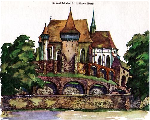 Birthälm besass die in ihrer ursprünglichen Form weitläufigste und stärkste Burganlage des Weinlandes, der sich auch die zwischen 1490 und 1524 erbaute Hallenkirche anpasst. Unverhätnismässig breit und hoch wirken die drei Hallen, deren Länge der geringen OW-Ausdehnung des Bergplateaus wegen nur 22 m misst, gegenüber dem 18 m langen, schmalen Chor, dessen Umfassungsmauern, bis zur Fensterhöhe, vielleicht noch vom vorhergehenden Kirchenbau beibehalten wurden. Auch liegt sein Rautengewölbe 3 m tiefer als das aus feinen Tonrippen gebildete Sternnetzgewölbe der Hallen, das von drei oktogonalen Pfeilerpaaren getragen wird. Bemerkenswert ist das gänzliche Fehlen der Schlusssteine. Die übermässige Höhe der Hallen trägt ihrer Lage auf dem Bergkegel Rechnung und ist auf die Wirkung des vom Tale her gesehenen Gesamtbildes der Burg bedacht. Fein ausgeführt ist das spätgotische Masswerk der fünf dreigeteilten Fenster im Chor, mit Vierpass- und Fischblasenmotiven über den Kleeblattbögen. In der Nordwand des lichtdurchfluteten Chores öffnet sich die berühmte Sakristeitür im steingemeisselten Türstock, dessen gekreuztes Stabwerk noch der Spätgotik angehört, während das gezahnte Gesimse darüber schon auf den Übergang zum Renaissancestil hinweist. Die mit minuziöser Einlegearbeit verzierte Eichentüre trägt neben dem Wappen des Plebans Johannes die Jahreszahl 1515. Das kunstvollste aber ist ihr riesiges Schloss und die durch eine Kurbel betätigte Hebelvorrichtung, mittels derer sich an drei Seiten breite Eisenbänder gabelartig vor die Türe schieben lassen, das Öffnen vom Chor aus unmöglich machen. Seiner seltenen Vorzüge halber schickte man denn auch dies Prachtstück siebenbürgischen Kunsthandwerks zur Pariser Weltausstellung von 1900. Die mit einem Rippengewölbe überspannte Sakristei besitzt ein Obergeschoss, zu dem an der Ostwand eine Wendeltreppe im aussen angebauten Treppentürmchen emporführt, obgleich es nie als Kultraum benützt worden sein kann, wie das roh zutage tretende, nicht mit Fussboden belegte Gewölbe erkennen lässt.