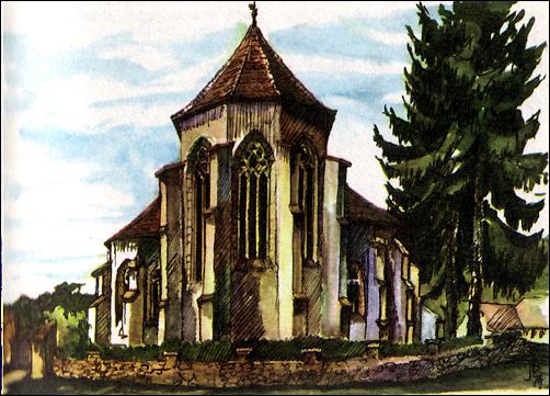 Folgen wir von Scharosch der Asphaltstrasse westwärts bis zum nächsten südlich abbiegenden Landweg, finden wir im Nachbartal das kleine Tobsdorf / Dupus, das sich 1268 noch "Tobiasdorf" und 1359 ville Tobiae schrieb, seinen Namen also einem Schutzpatron verdankt. Auch von Birthälm aus ist es zu Fuss in einem Spaziergang über den Berg zu erreichen. Eine sieben Meter hohe Ringmauer umgab im Fünfeck die inmitten des Dorfes stehende Kirche; 1901 hat man sie abgetragen, um mit dem Baumaterial die alte, baufällige Schule zu ersetzen. Nun bietet sich die kleine turmlose Saalkirche dem Blicke frei dar. Von Osten gesehen meinen wir die Zwillingsschwester der Klosdorfer Wehrkirche (Komm mit 72, S.10) vor uns zu haben: Chor und Saal von gleicher Breite, von Strebepfeilern umstellt, zwischen denen sich flache Bögen spannen, die das Wehrgeschoss tragen und in ihrem Schatten die Gussscharten verbergen. Charakteristisch auch der steinerne Wulst, der als Gesimse das mit Schlüsselschiessscharten versehene Wehrgeschoss umzieht. Ein einziger Dachstuhl deckt den einheitlich hohen Bau. Die Klosdorfer Wehrkirche wurde laut inschrift 1524 von Maurermeister Stephanus Ungar aus Schässburg vollendet. Und tatsächlich: An der Westwand, hinter der Orgel, steht auch in Tobsdorf: "1524 Renovatu ac fortificatum / hoc Templum / Alemon(y)u(s) parti(e)m past(orem)..."