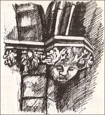 | Pfeilergesimse und Rippenkonsole im Nordwestteil der Basilika. | Schlussstein mit Peikanmotiv, aus dem Chor. |