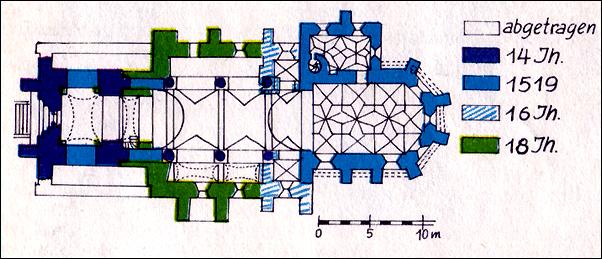1795/99 ersetzte ein Tonnengewölbe mit Stichkappen die Holzdecke über dem Mittelschiff, dessen alte Obergaden und Deckenbalken über dem Ziegelgewölbe mit Dachstuhl noch sichtbar sind. 1802 erlitt der Bau Erdbebenschäden, die aber erst 1830 behoben wurden, als man, der wachsenden Einwohnerzahl Rechnung tragend, die Osthälfte der Seitenschiffe wieder aufbaute und die Arkaden zum Mittelschiff öffnete. Im Westteil wurden sie aber nicht wieder den Turm entlanggeführt, war doch eine Westempore für die Orgel eingebaut worden, die solches verhinderte. Es ist interessant, die Rätsel, die der Kirchenbau beim ersten Anblick aufgibt, durch näheres "logisches" Betrachten zu lösen.