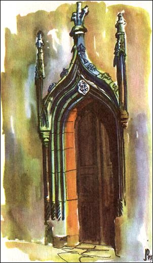 Die Nordseite ist lichtlos, die Spitzbogen der schmalen Südfenster haben ihr Masswerk verloren, nur das Ostfenster des Chores und das im Westgiebel gelegene haben noch steingemeisselte Kleeblattbogen mit Vierpässen darüber. Das alles bietet keinen Anhaltspunkt zur Datierung. Doch da steht in der schmalen Westfront ein Portal, dessen vollendete Eleganz und schwungvolle Linienführung uns sehr bekannt anmutet: ein hochgezogener, in einer Kreuzblume auslaufender Kielbogen, von zwei schlanken Fialen flankiert - das Dekorationsschema des Westportals (1448) der Hermannstädter Stadtpfarrkirche! Allerdings - am Waldhüttener Portal kreuzen sich die runden Profilstäbe des Gewändes im Bogenscheitel, während sie sich drüben zum einfachen Spitzbogen schliessen. Unter dem Scheitelpunkt hängt ein steinernes Wappenschild mit einem Steinmetzzeichen - oder sollte es die Jahreszahl 1441 darstellen? - wissen wir doch, dass der gotische Vierer wie der halbe Achter aussah! Wir nehmen letztres an - ein Meisterzeichen durfte nicht so augenfällig, ja protzig, angebracht werden! Die Beziehung zur Hermannstädter Bauhütte aus der Mitte des 15. Jh. wird an mehreren Monumenten der nächsten Umgebung offenbar: Reichesdorf, Meschen, Hetzeldorf. Wie immer - glücklich der Meister, dem es gegeben war, mit solcher Gebärde die Jahrhunderte zu überdauern! Umso erstaunlicher, ja erschütternd wirkt der anmutige Schwung, der harmonische Fluss der Lichter und Schatten zwischen dem zarten Stabwerk dieses Türrahmens, als es so unerwartet auf der mächtigen, eintönig-grauschwarzen Steinfläche der Westfront hervortritt, rings nur vom hohen, rotbraunen Sandsteinmauerwerk der Wehrbauten umgeben.
